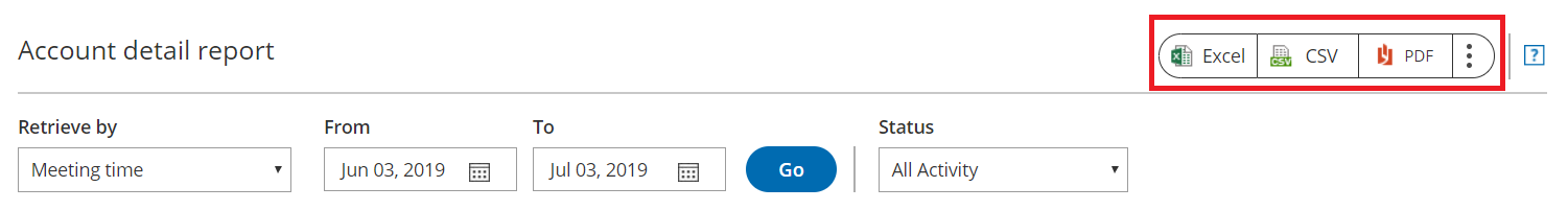 Section titled “Exporting Account reports”You can export an Account report as an Excel, CSV, or PDF file. To export a report, click on the Excel, CSV or PDF button in the top right corner of the report page (Figure 1).
