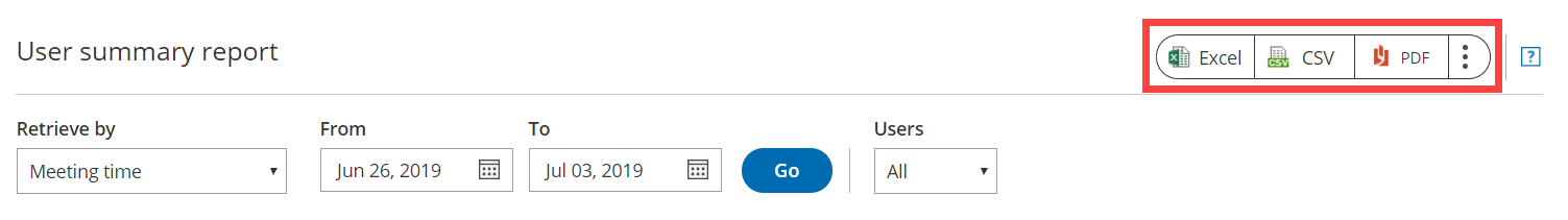 Section titled “Exporting a User report”You can export a User report as an Excel, CSV, or PDF file. To export a report, click on the Excel, CSV or PDF button in the top right corner of the report page (Figure 1).