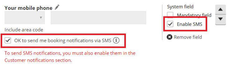 Section titled “Enable SMS notifications for the Mobile phone System field”If you want to send booking-related SMS notifications to your Customers, you must provide them with an option to opt out of this service.