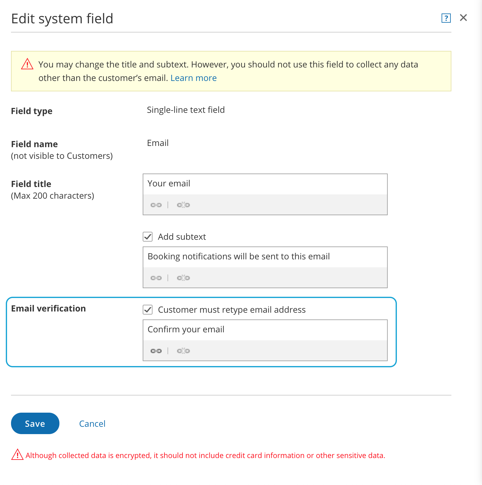 Section titled “Require email verification for the email System field”If you are worried about Customers mistyping their email address when making a booking, you can turn on the Email verification option in the email Edit system field pop-up for the Email field (Figure 3).