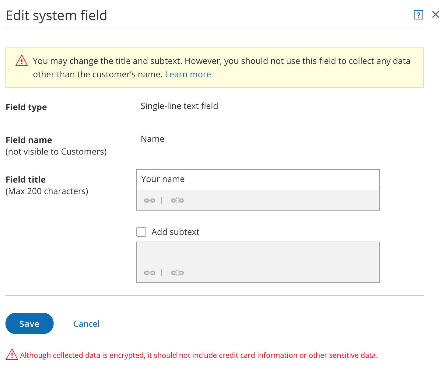 Section titled “Add subtext”To add subtext to a field, check the Add subtext box. Then, enter a description of the field or explain why you are asking for the information.