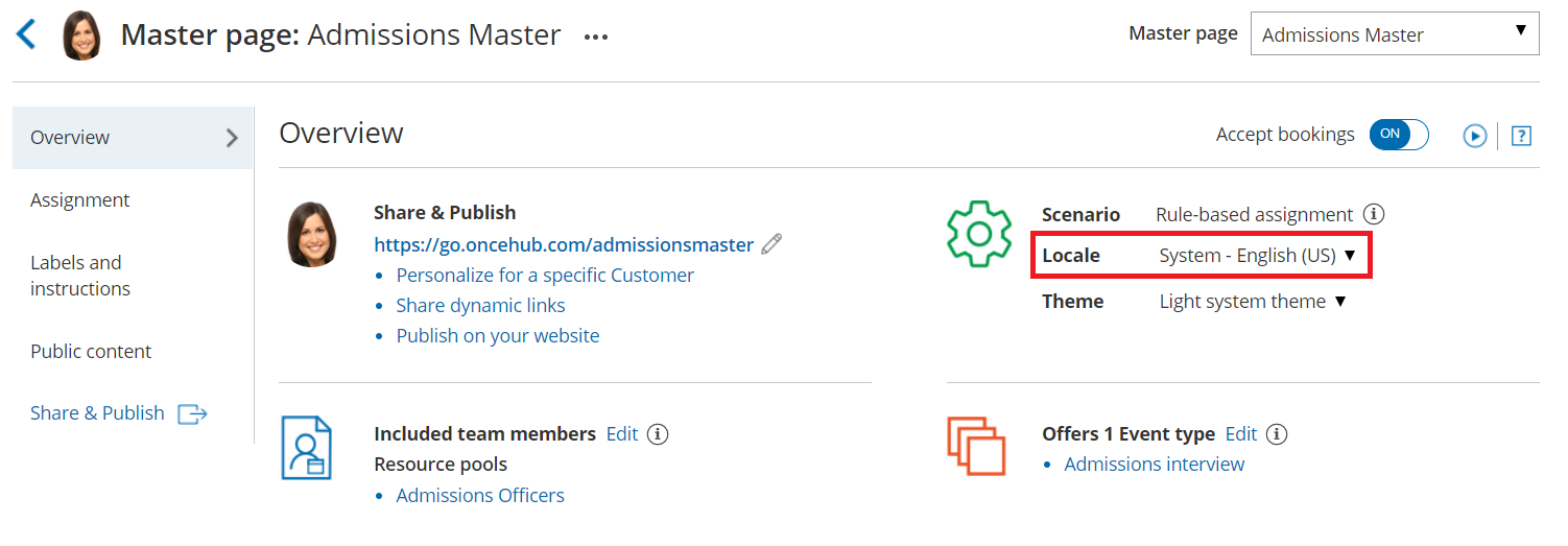Figure 4: Selecting a Locale in the Master page Overview sectionNoteThe locale selected for the Master page will override the locale selected on any of the included Booking pages.