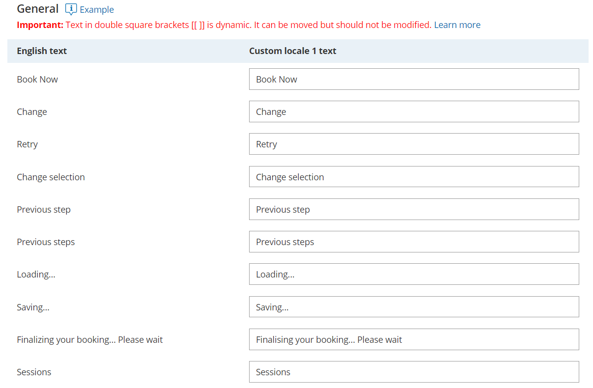You can use System locales provided out of the box or create Custom locales, which allow you to edit Customer interface text. System and Custom locales are managed in the Localization editor, and can be applied to Booking pages and Master pages.