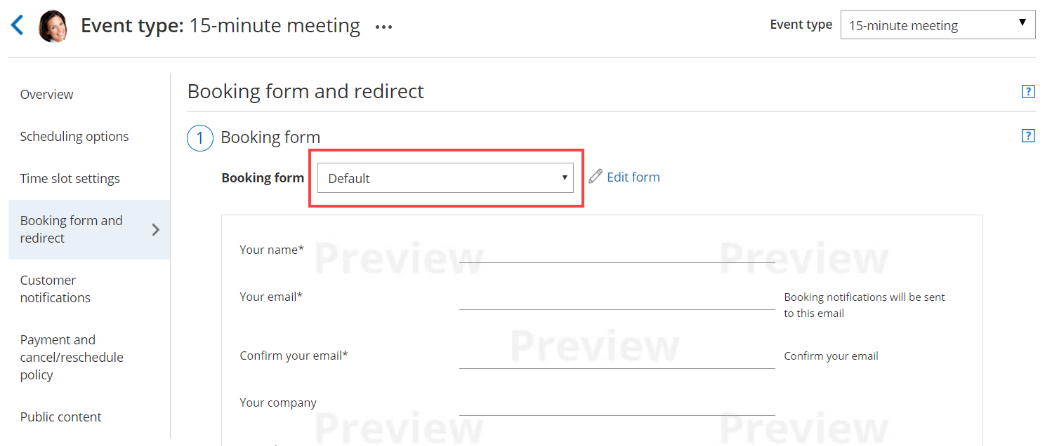 In the Booking form section of your Event type, use from the Booking form drop-down menu to select a Booking form (Figure 1).