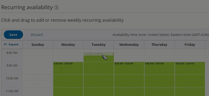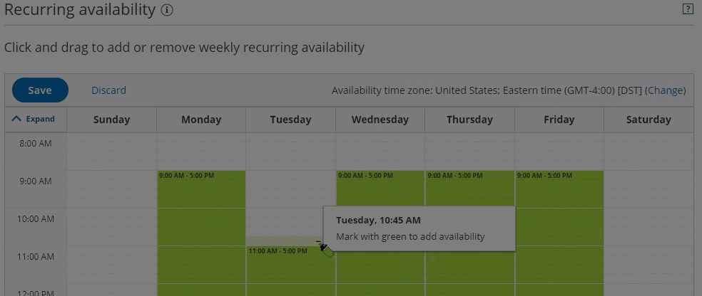 - Increase availability: Use Date-specific availability to add availability on top of Recurring availability. For example, if you were on vacation on a certain week, the week after the vacation you could make up for it by making yourself available until late in the evening.