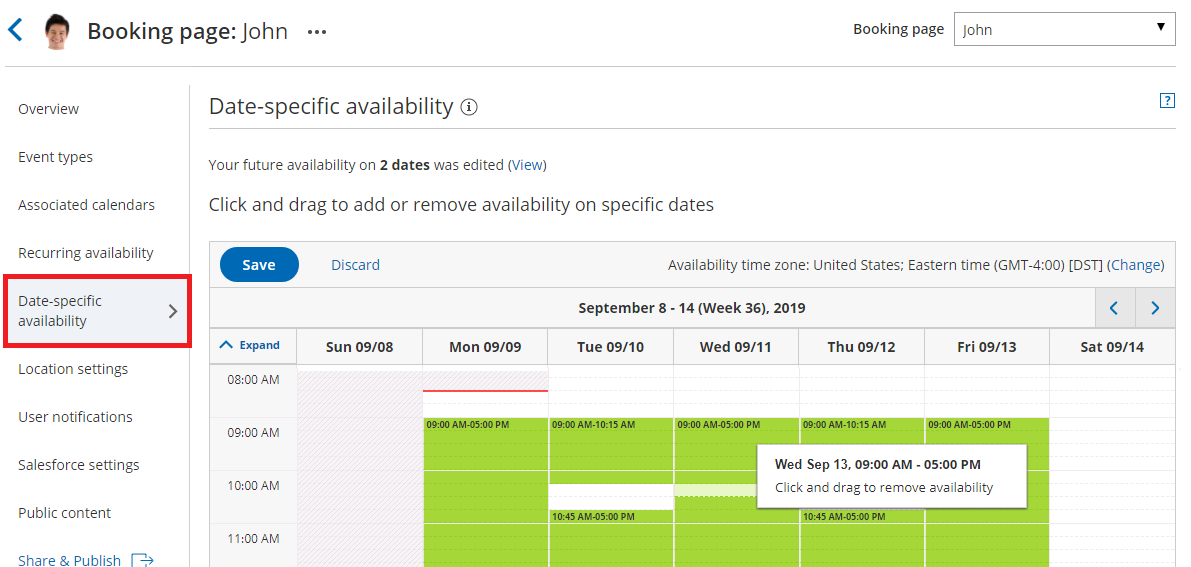 When you define availability for a specific Booking page rather than through your User profile, you can use two types of availability: Recurring availability and Date-specific availability. Date-specific availability is defined for specific days so that you can designate your availability for each calendar day.