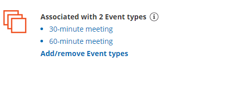 Use this list to review the Event types that are associated with the Booking page. To edit an Event type, click on it in this list to navigate to it. We recommend associating your Booking pages with at least one Event type.