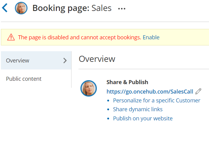 Figure 3: Booking page Enable link - The Booking page will also be labelled as [Disabled] in the Booking page scheduling setup page (Figure 4).