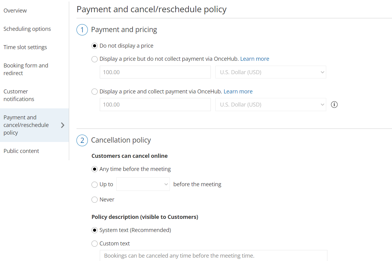 Section titled “Do not display a price”When you choose not to display a price, you define the timeframe during which Customers are permitted to cancel or reschedule a booking. You can also customize the policy description visible to Customers on the Cancel/reschedule page. Learn more about the Cancel/reschedule policy when not displaying a price