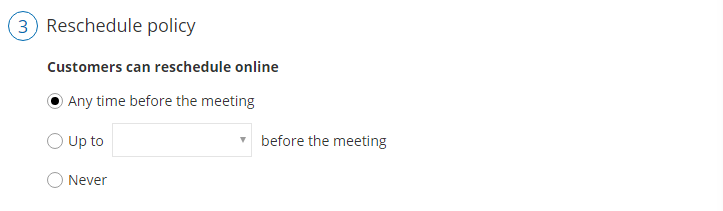 Up to a certain time before the meeting: In this case, you can select how long before the scheduled meeting time that the Customer can reschedule. The possible values range from 15 minutes to 14 days.