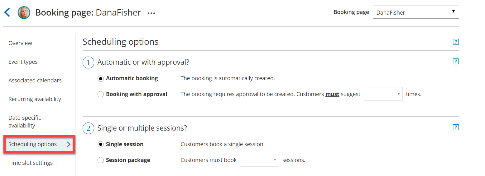 Scheduling options are located on the Booking page by default. If you associate Event types with your Booking page, the Scheduling options section is located on the Event type. This allows you to standardize the settings for your scheduling scenarios. Learn more about associating Event types with Booking pages