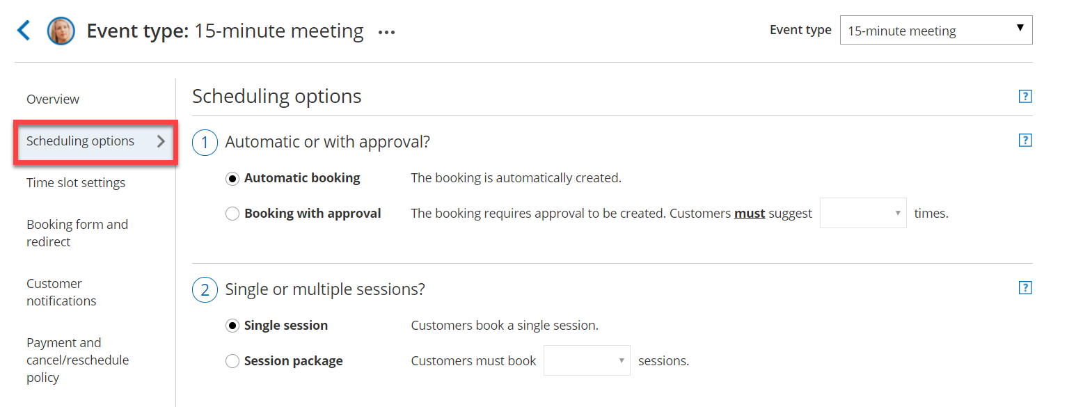 Figure 1: Scheduling options section when your Booking page has associated Event types
