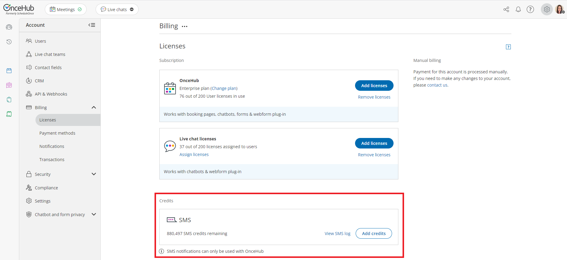 Section titled “Ensuring you have SMS credits available”You need to have SMS credits available to send SMS notifications. To view the SMS credits available in your account, click go to Settings (gear icon) in the top right corner → Billing on the left → Licenses.