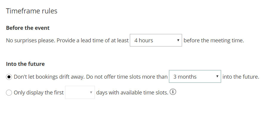 Timeframe rules allow you to limit the timeframe for accepting bookings Before an event and Into the future.