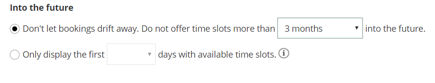 This setting determines how far in advance Customers can make bookings with you. You can limit Customers’ choice to book into the future in one of two ways: