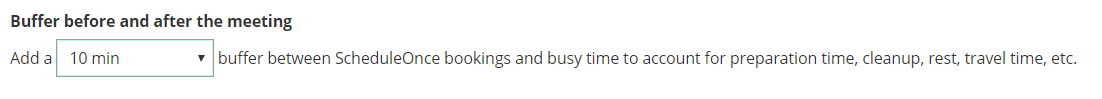 Section titled “Buffer before and after the meeting”The booking buffer automatically creates gaps between time slots and busy time on your calendar. These gaps can be used to account for travel time, cleanup time, rest time and more. If you don’t want the buffer to affect you, simply leave it on its default, at zero.