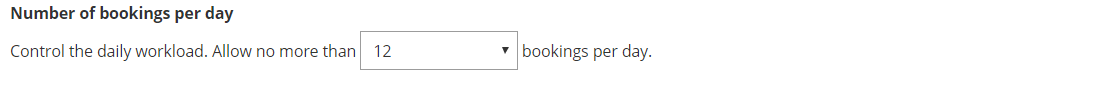 Section titled “Number of bookings per day”This setting allows you to set a cap on the number of bookings that can be scheduled per day. When the cap is reached, the entire day will become unavailable and no more bookings will be accepted. Learn more about limiting the number of bookings per day
