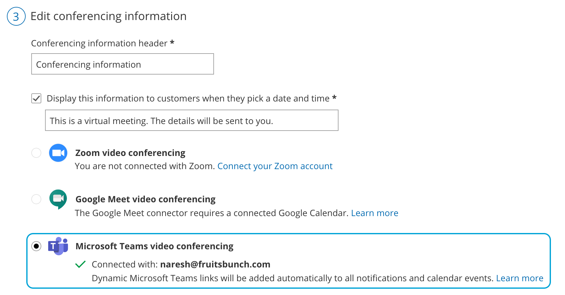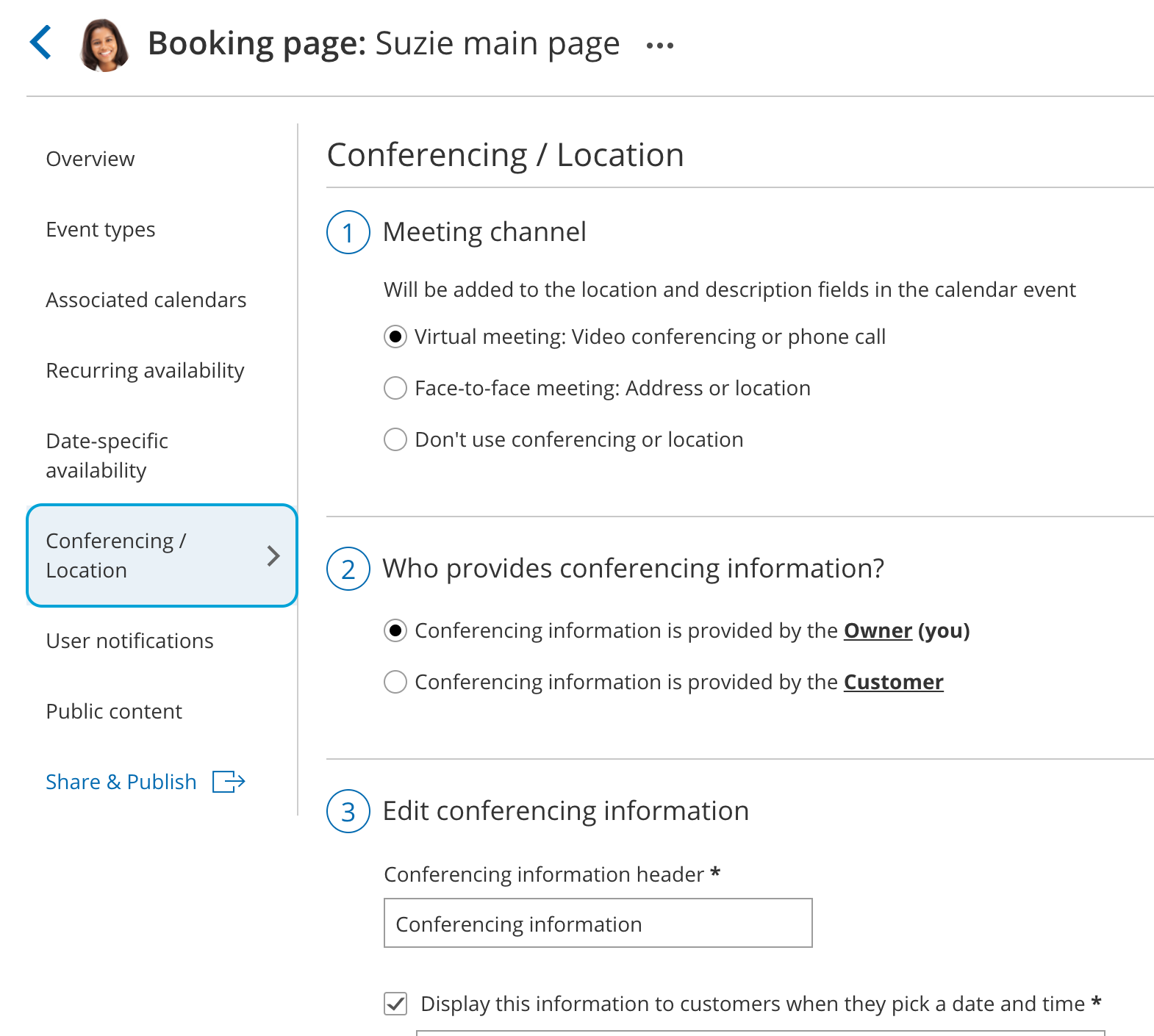 - Select your video conferencing app in the Conferencing / Location section for your Booking page.