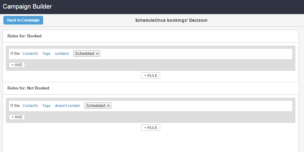 - The first rule should tag leads that DID make a Booking when Tags contain “Scheduled”