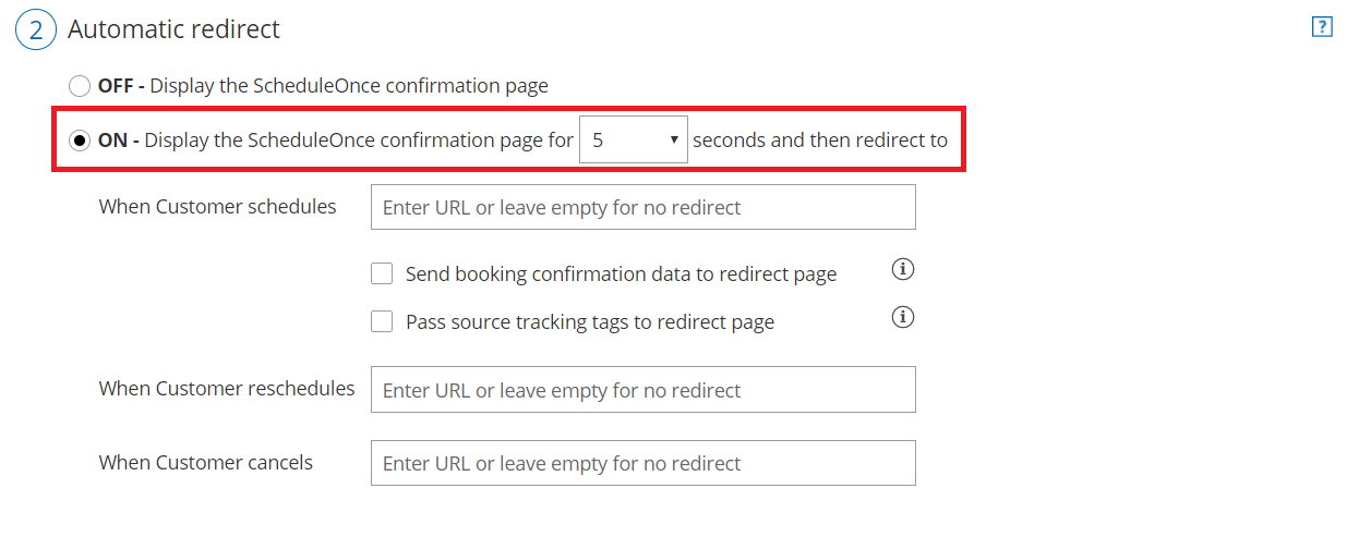 Section titled “1. Enable Automatic redirect”In order to turn on source tracking for bookings made through your private website, you must enable Automatic redirect. OnceHub does not store source tracking information internally, and only facilitates the passing of your UTM tags to a third-party page.