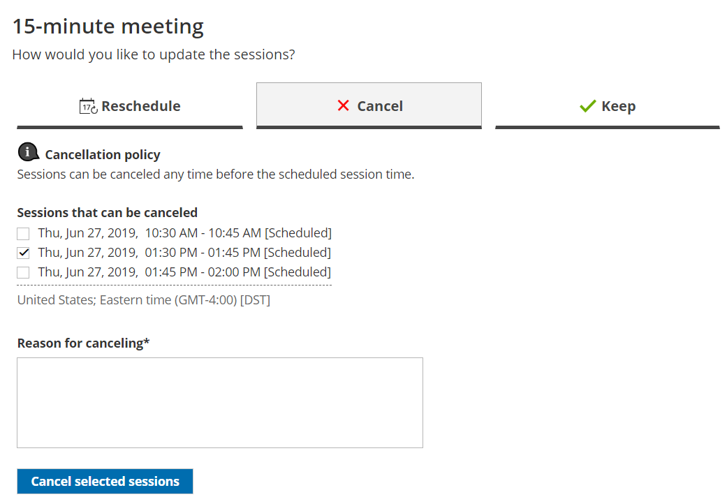 - In the Cancel tab, the Customer selects the sessions that they want to cancel (Figure 2). Depending on your Cancel/reschedule policy, the Customer can be asked to provide a reason for canceling.