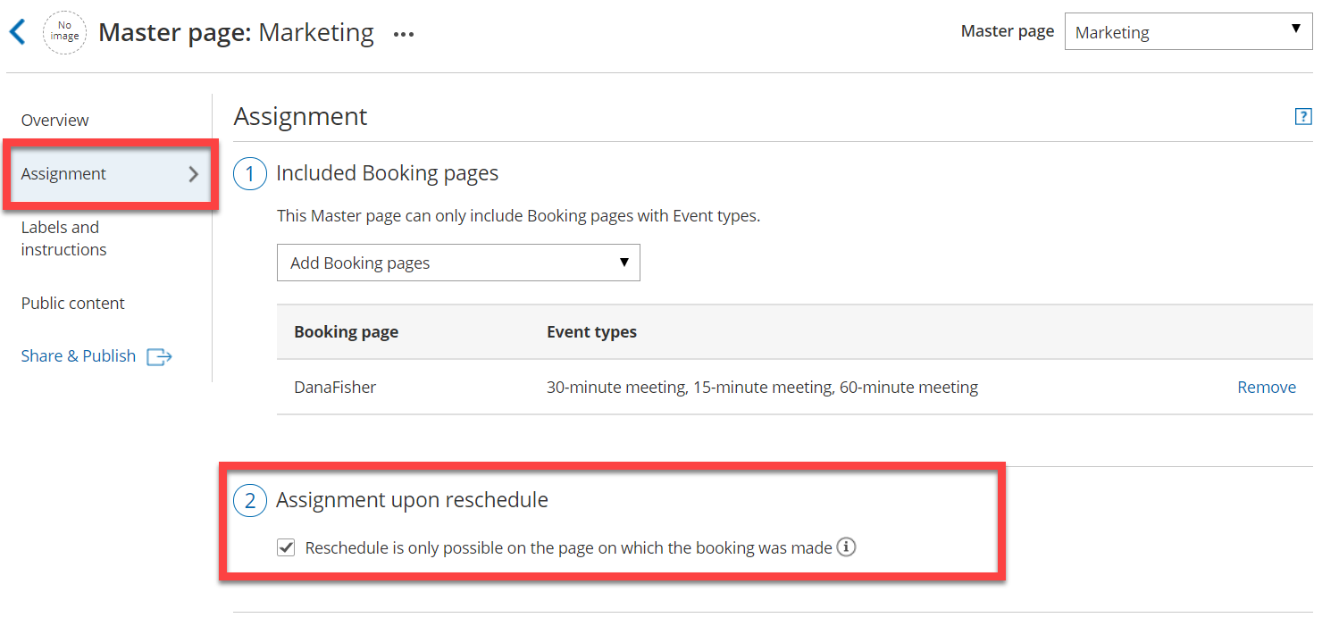 If your Master pages uses Event types first or Booking pages first: in Assignment upon reschedule section, check the box marked Reschedule is only possible on the page on which the booking was made (Figure 2).