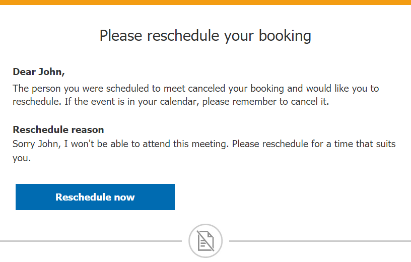 Section titled “User sends a request to reschedule for the same Event type”In this case, the Customer clicks the Reschedule now button in the reschedule request email notification (Figure 3) and reschedules the booking. In the Activity stream, the original activity is canceled and a new activity is created when the Customer reschedules. Learn more about rescheduling by User with Event types