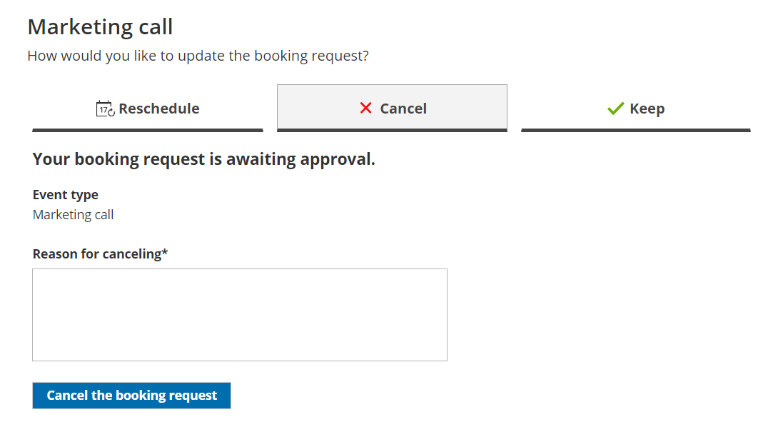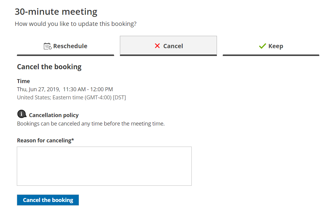 The Cancel/reschedule page allows Customers to cancel and reschedule bookings subject to the Cancel/reschedule policy you set on your Booking page or Event type. Customers access the Cancel/reschedule page by clicking the Cancel/reschedule link in the scheduling confirmation email or the calendar event for the booking.