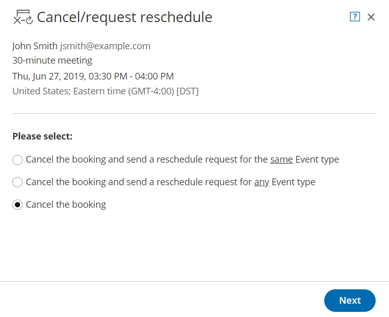 - Cancel the booking and request reschedule for the same Event type: The Customer will only be able to reschedule with the same Event type that they originally booked on your Booking page or Master page. If you use Payment integration, the Customer will not be asked to pay any reschedule fee. The payment data will be reassigned from the cancelled booking to the rescheduled booking in the Activity stream after the Customer reschedules.