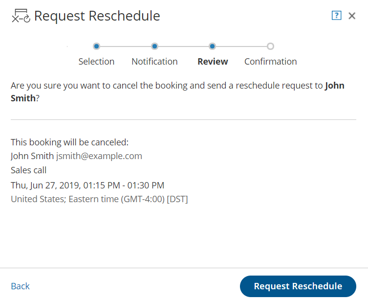 - The original booking will be canceled and the Customer will receive an email notification to reschedule. The Booking page Owner and any additional stakeholders with also receive an email notification. Learn more about notification scenarios