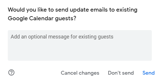 Section titled “The Customer calendar event”Whether your Customer’s calendar will be updated or not depends on your choice in Google’s Would you like to send update emails to existing Google Calendar guests pop-up. Make sure to click the Send button, so that your Customer’s calendar is updated. Learn more about the Customer’s calendar event