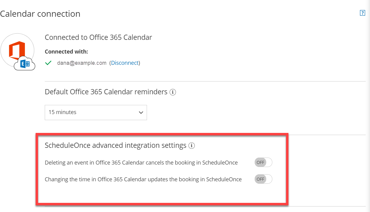 Under the OnceHub advanced integration settings heading, you will see two toggles (Figure 1). These control how the Office 365 Calendar two-way sync will function. By default, both toggles are set to OFF.