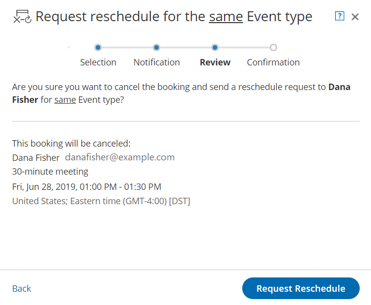 - In the Review step (Figure 3), you can confirm the details of the booking that you’re about to cancel and request that the Customer reschedules.