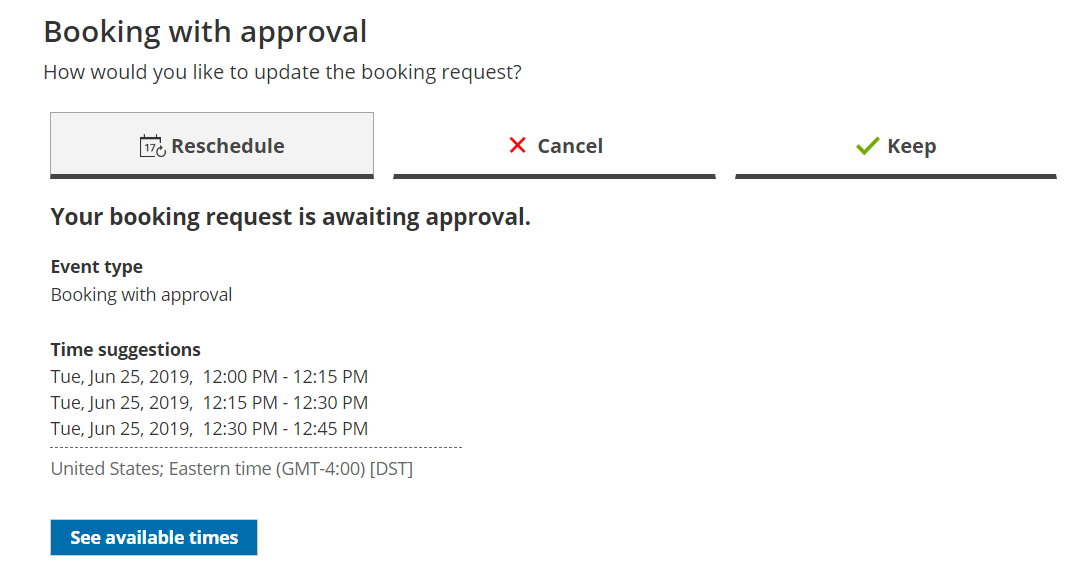 Section titled “How Customers resubmit a booking request”- To resubmit a booking request, the Customer clicks the Cancel/Reschedule link in the scheduling confirmation email