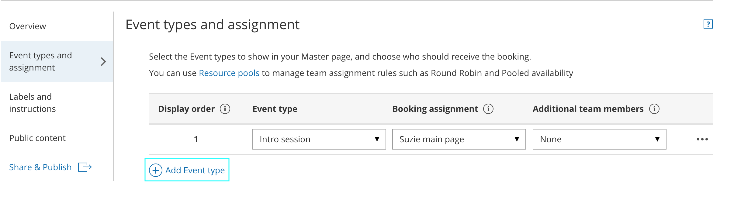 Next, use the Booking assignment drop-down to select who will provide your Event types. The Booking assignment can be a specific Booking page or a Resource pool.