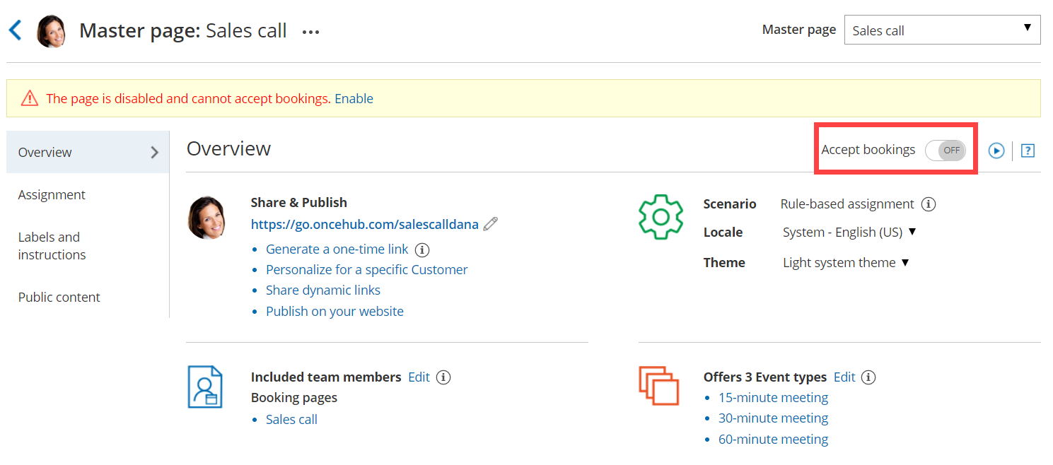 - In the Master page Overview section, set the Accept bookings toggle to OFF (Figure 1).