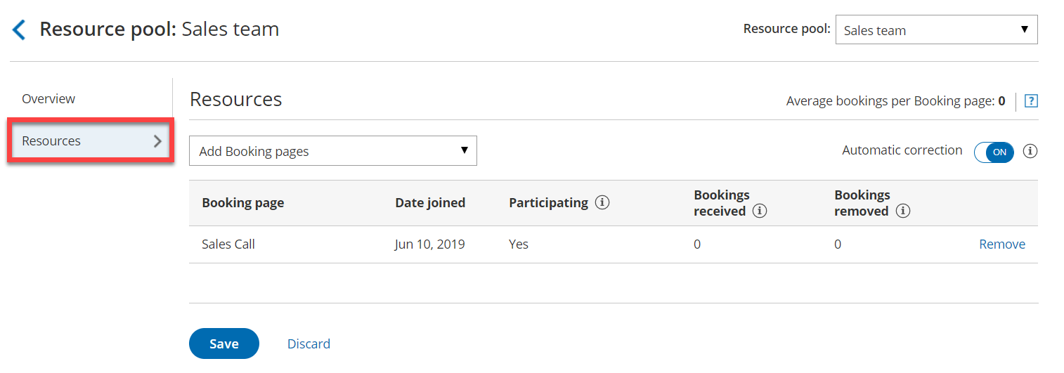 Figure 3: Resource pool Resources section - Select the Booking pages you want to add from the drop-down menu.