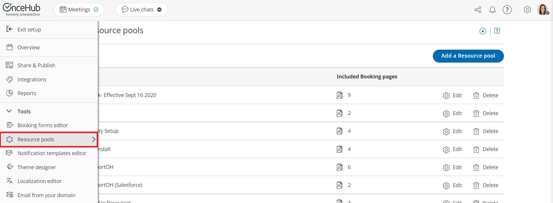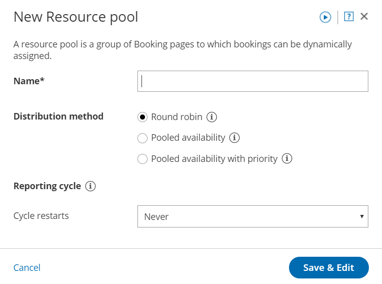 Resource pools allow you to dynamically distribute bookings among a group of Team members in the same department, location, or with any other shared characteristic. Each Resource pool has its own method for distributing bookings, such as Round robin, Pooled availability, or Pooled availability with priority.
