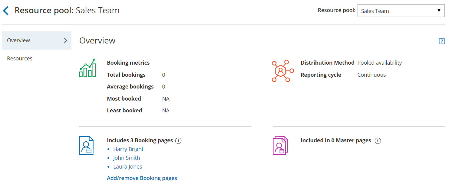Each Resource pool groups Booking pages together according to characteristics you define. Here, you will see a list of all the Booking pages that are included in the specific Resource pool.