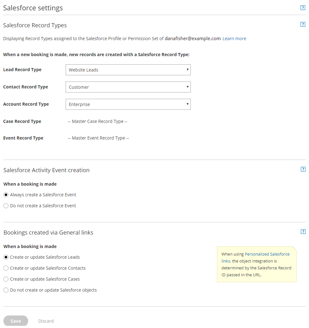 The Salesforce connector settings section of a Booking page enables you to map the Salesforce Record Types, configure the Salesforce Activity Event creation, and configure the integration when bookings are created using General links for your Booking page.