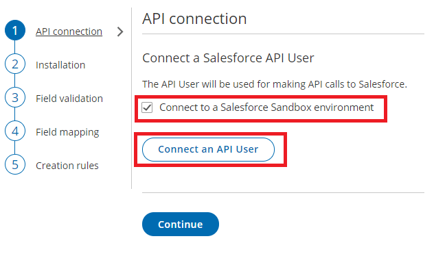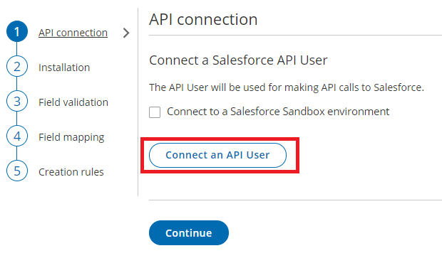 On the API Connection step, click Connect an API User to connect to an API User created in your Salesforce production environment (Figure 2).