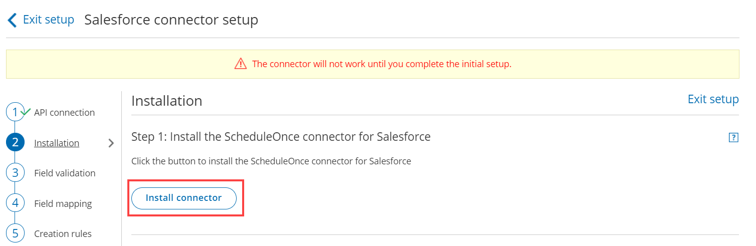 The Salesforce setup process includes 5 phases: API connection, Installation, Field validation, Field mapping, and Creation rules.