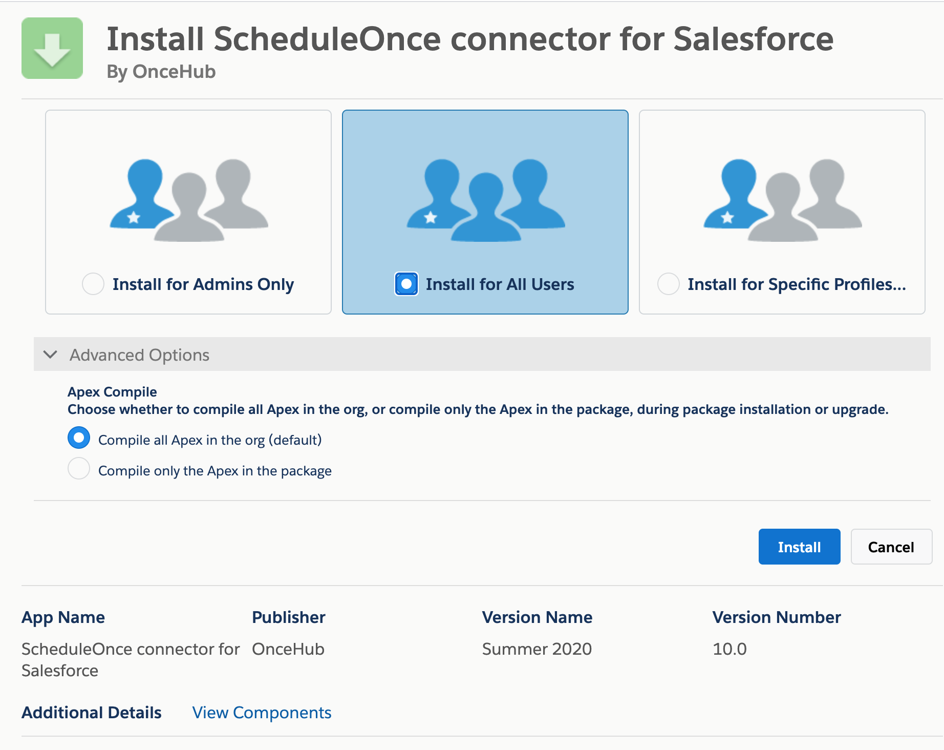 Installation is a three step process. In this article, you will learn about the first step: installing the OnceHub connector package in Salesforce. The OnceHub connector for Salesforce is installed directly from OnceHub.
