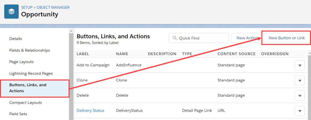 Section titled “Adding a button to Salesforce Page Layouts”The next step is to add the new button you’ve created to the relevant Salesforce Opportunity Page Layouts.