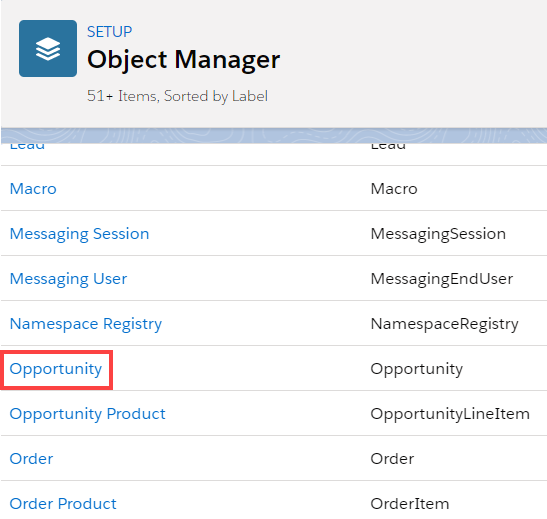 Figure 2: Object Manager in the Objects and Fields menu - In the Object Manager list, select the Opportunity object (Figure 3).