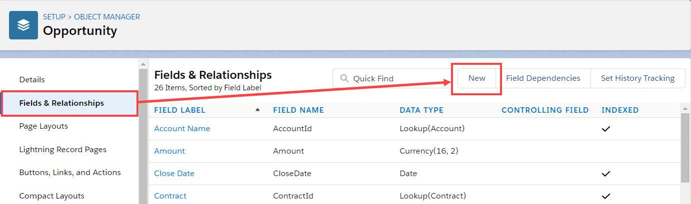 Figure 3: Opportunity in the Object Manager list - Select Field & Relationships -> New (Figure 4).