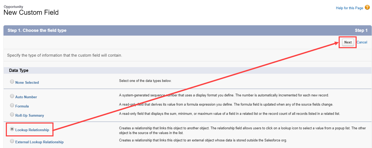 Section titled “Creating a Contact Lookup field”First, we will add a Lookup custom field to the Opportunity record.