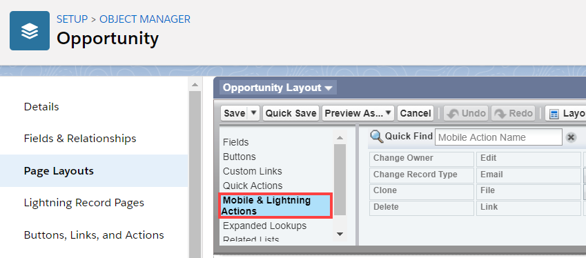 Figure 10: Page Layouts - In the Opportunity Layout editor, select Mobile & Lightning Actions (Figure 11).