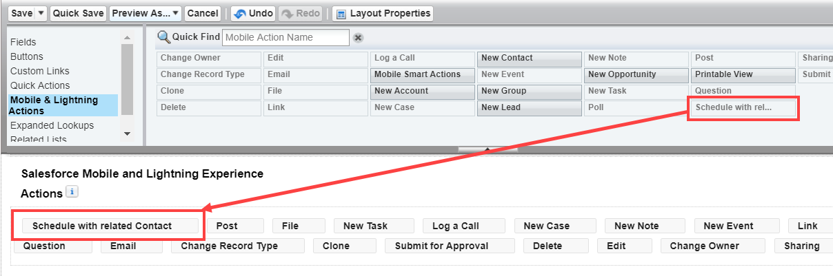 Figure 11: Mobile & Lightning Actions - Click and drag the Schedule with related Contact button to the Salesforce Mobile and Lightning Experience Actions section (Figure 12).