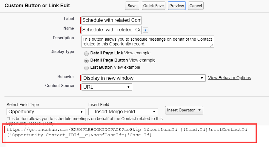 Section titled “Creating a button in Salesforce”Now you can create the button to add to the Opportunity Page Layout. The button will retrieve the Contact ID from the custom Contact Lookup field. When clicked, you will be able to make a booking on behalf of the Contact added to that Opportunity.